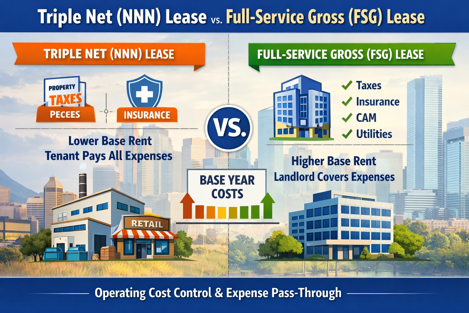 - Responsibility: NNN shifts operational risk to the tenant; FSG keeps risk with the landlord.